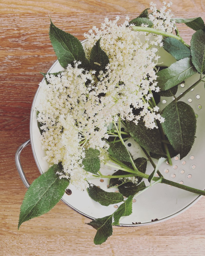 There are many things I should rather be doing this morning than baking, or eating, a cake… but the elderflowers are in full bloom, the time will pass in an instant. So I walked over to the elderflower tree at the bottom of our road, nipped a few overhanging flowers, and began to bake.