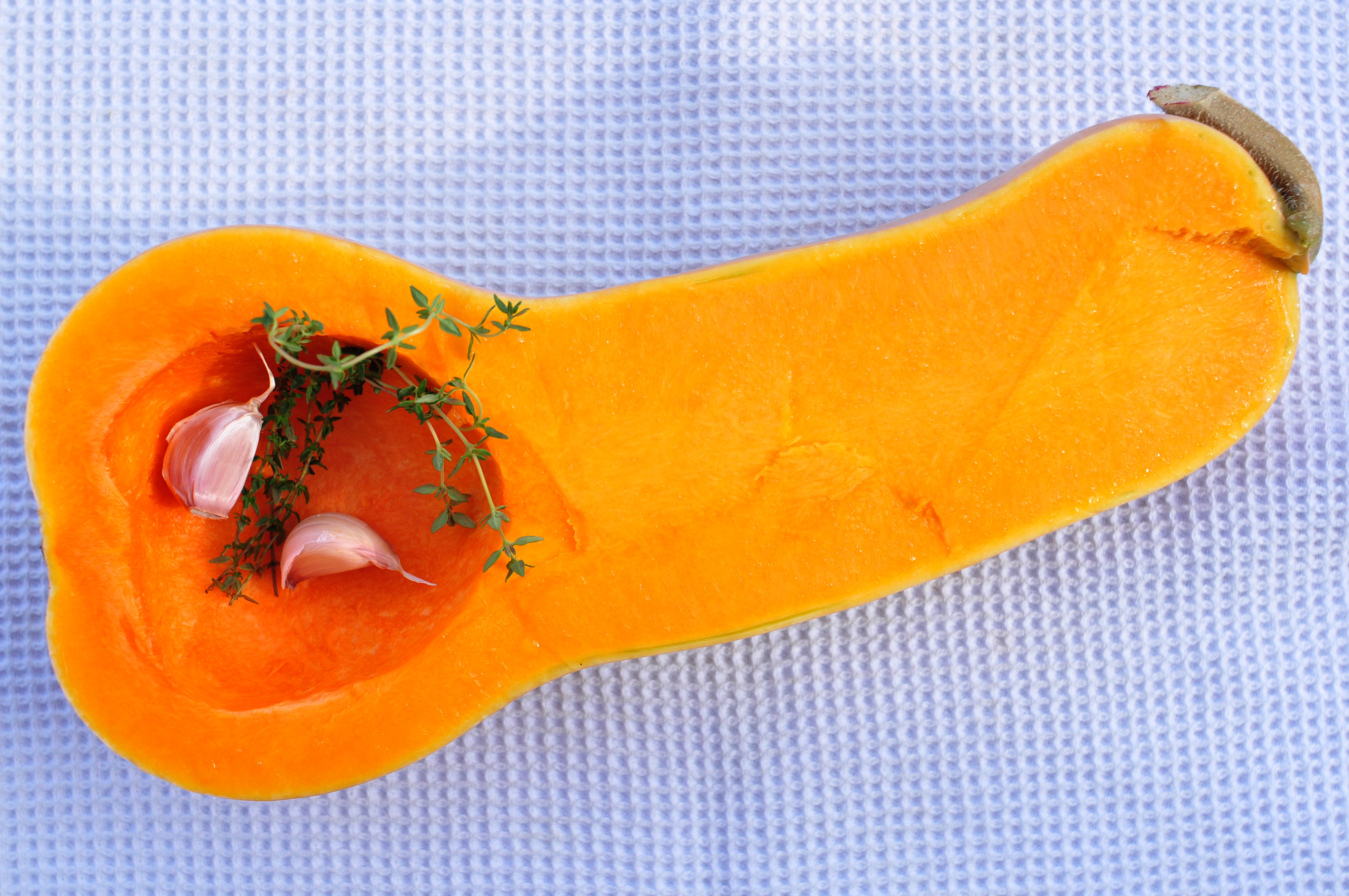 Cut butternut squash in half lengthwise. Scoop out seeds. Smear olive oil over cut surface of the squash. Place garlic clove and thyme in the cavity made by removing the seeds. Turn squash over onto ovenproof dish, cut side down, and bake in oven for 35-40 minutes. Poke through the skin with a knife to test; the flesh should be very tender.