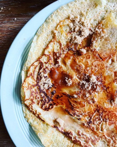 Garnish with the filling of choice — classic sugar and lemon, or jam, chocolate, apple sauce, etc. — then roll or fold the crêpes to eat!