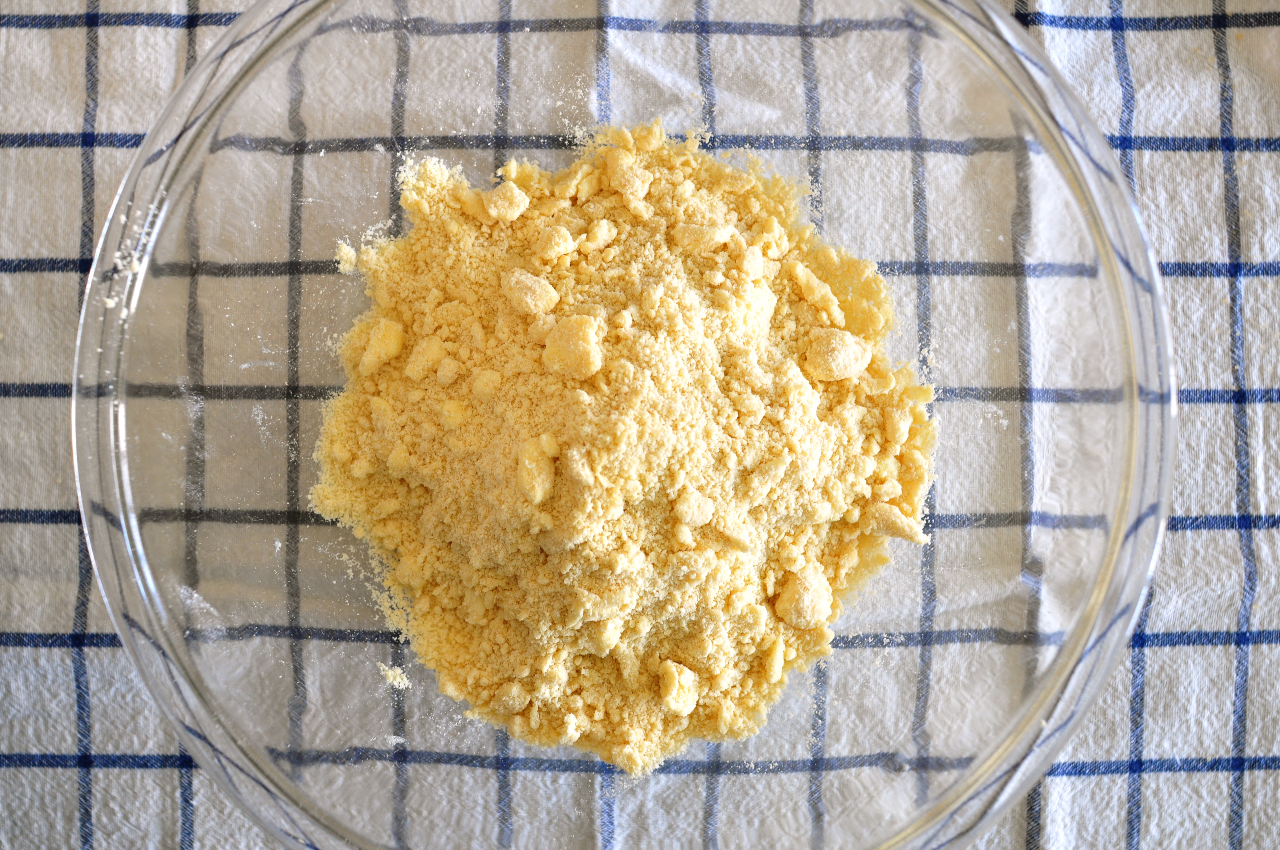 Gently work half of the butter into the flour mixture with fingertips until dough has the texture of coarse oatmeal. Add the rest of the butter and work it into the dough quickly, stopping as soon as the largest pieces of butter are the size of lima beans.