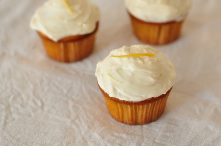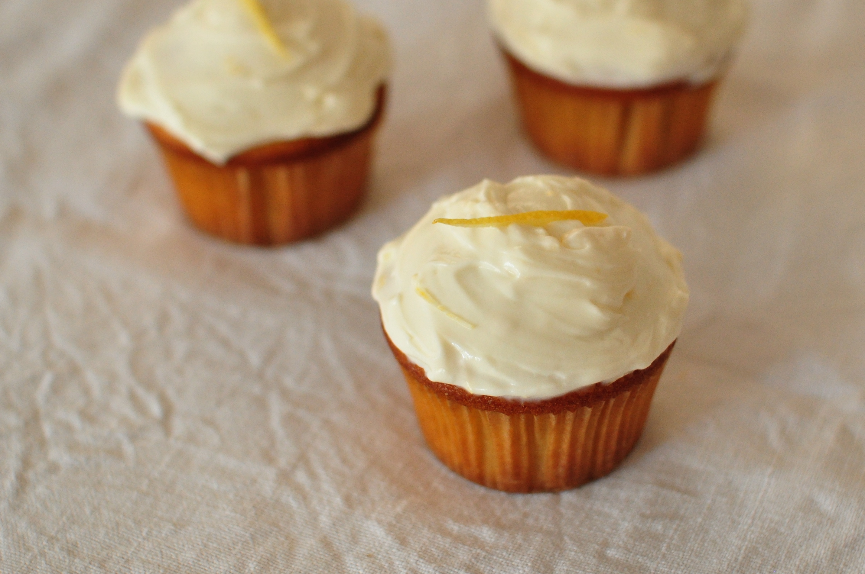 Mix the mascarpone with the icing sugar, grate one lemon and blend the zest into the mascarpone. Taste, add some zest if you want a stronger lemon flavor. Ice the cupcakes just before serving and add a thin strip of lemon rind or a raspberry for decoration.