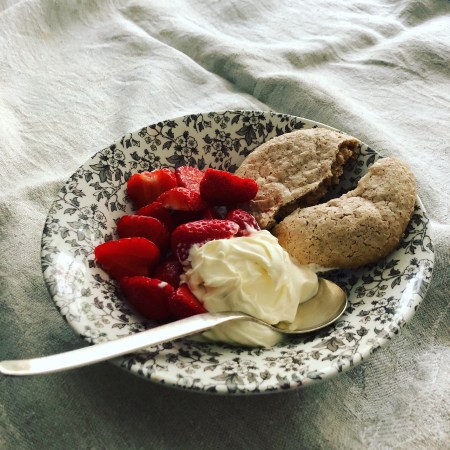 The best companion for these almond macaroons is rhubarb compote and a spoonful of cream. In winter, apple sauce. But today I have strawberries, and that’s good too.