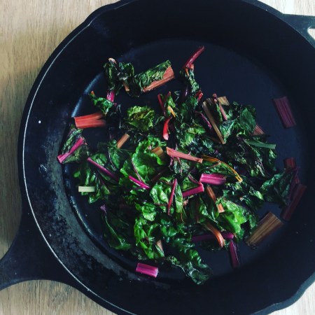In a cast-iron skillet, heat a generous drizzle of olive oil, throw in the chard, season with salt and the squeezed juice of one lemon. Toss the chard a few times as it ‘melts’ (it will reduce drammatically!) so the leaves underneath don’t burn. Once the chard is cooked (this takes just a few minutes!), add the peeled fava beans. They need only be warmed through with the residual heat from the skillet. Remove the chard and favas and place in a bowl, covered to stay warm.