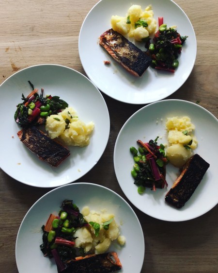 Turn the heat up under the skillet, add another generous drizzle of olive oil, and once the pan is very hot, place the salmon fillets skin side down. You will be able to see the salmon cooking from the bottom up: after 3 to 5 minutes, once the heat has reached through to about one third, flip the fillets over, leave for 30 seconds and turn off the heat. The salmon will continue to cook just enough while the rest of the food is plated. It should be rare in the middle.