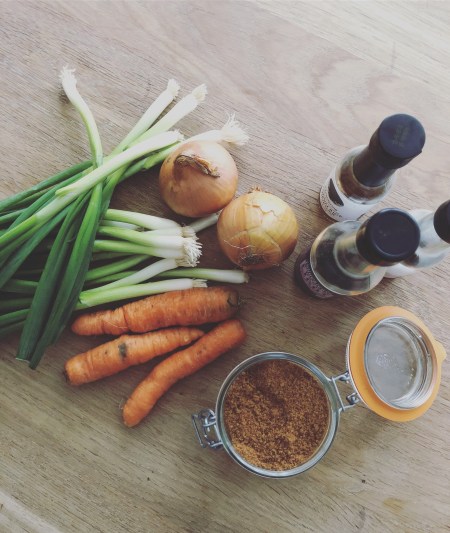 Prepare the vegetables: Peel and coarsely chop the onion, carrot, and scallions. Peel and smash the garlic cloves. Peel and cut the ginger into matchsticks.