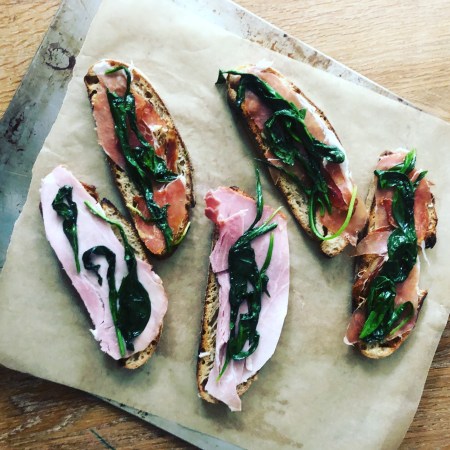 The secret weapon here is a bunch of early wild garlic. I have nothing against plain ham and cheese, but will always try to add something: tomatoes roasted with garlic (even better than fresh), grilled fennel, kimchi (!!) if I had any.