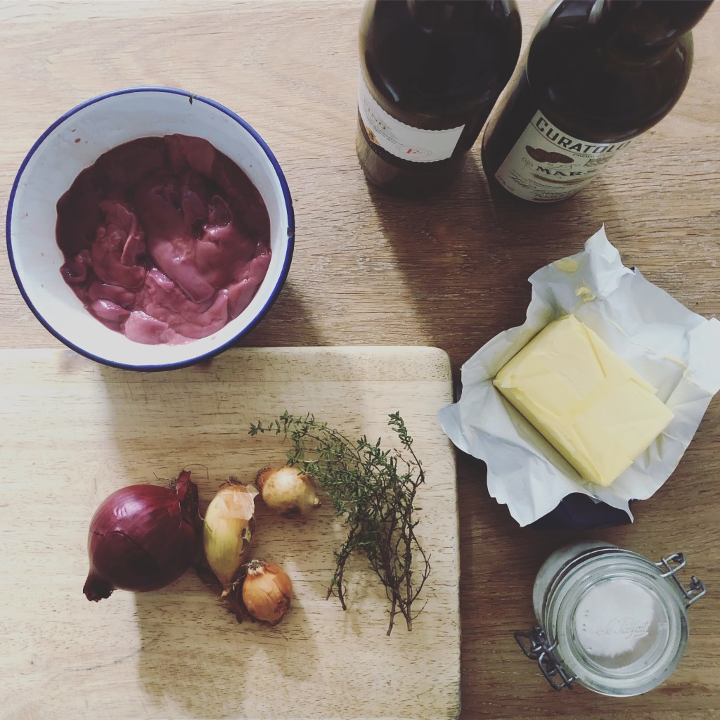 ‘Trim’ the chicken livers, meaning cut off the sinew and carefully remove any green (it’s the gallbladder which is bitter).