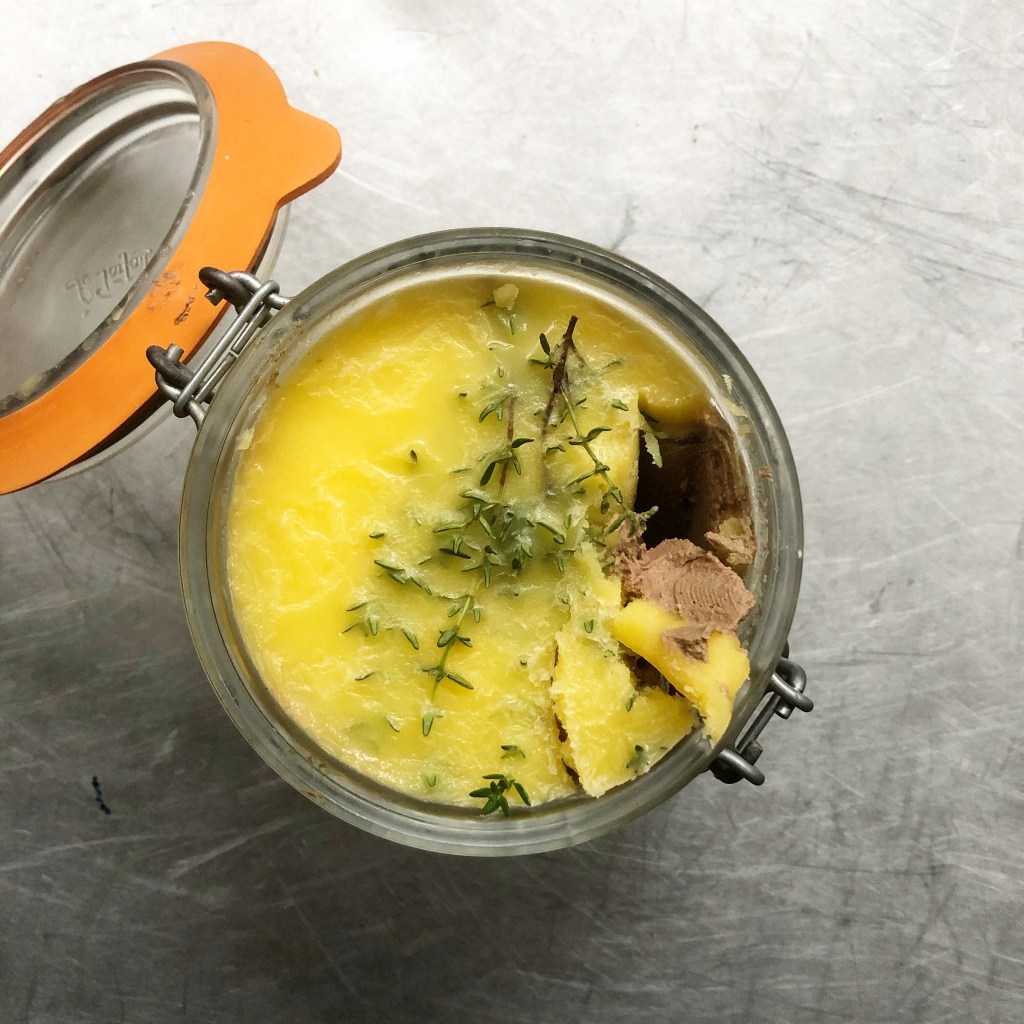 Transfer the mousse to a bowl or terrine, cover with the remaining melted butter. Let cool before transferring to the fridge for a few hours at least.