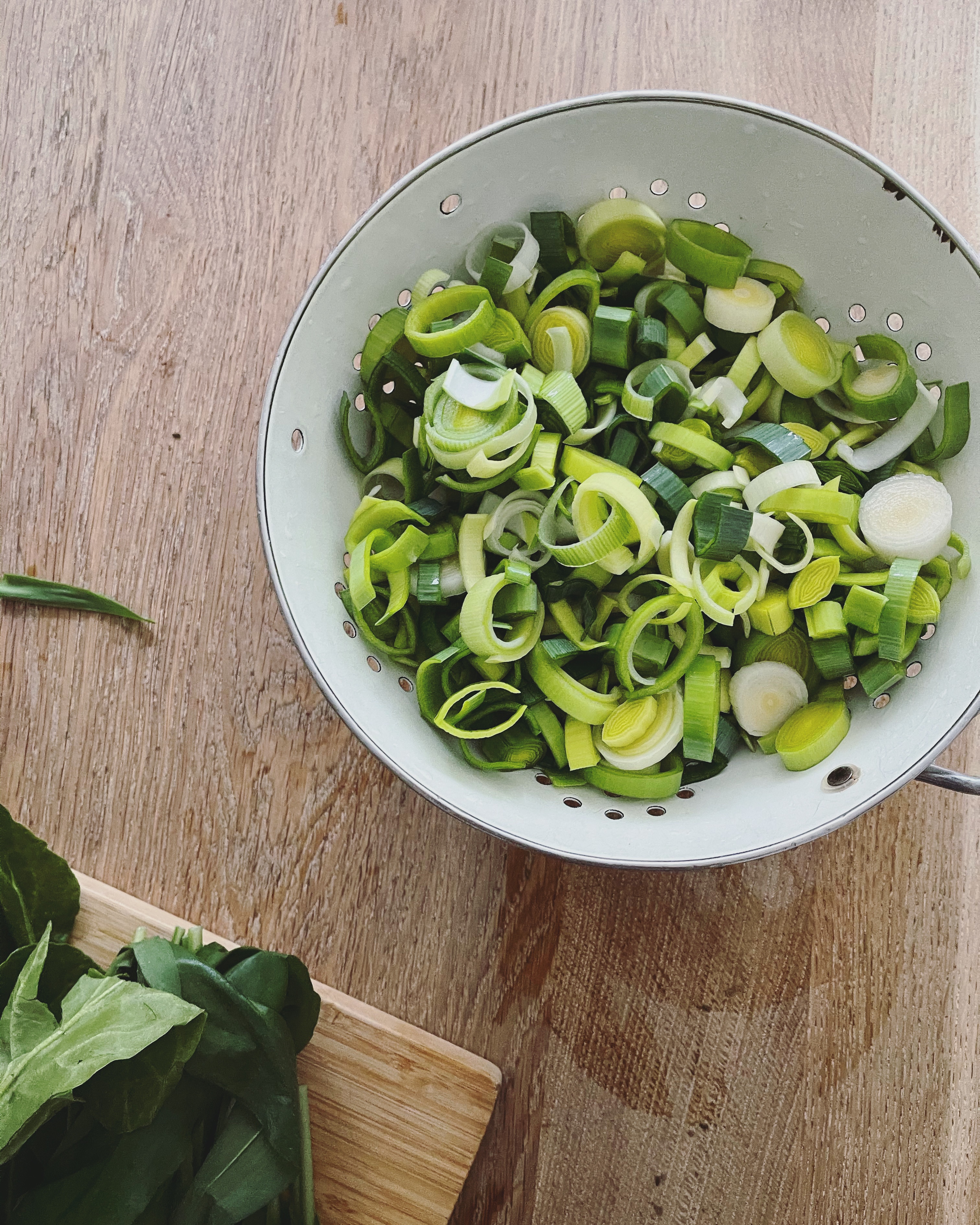 In addition to the leeks and wild garlic, I’ve used another leaf, erbette spinach (aka erbette chard or perpetual spinach), which adds herbaceousness and really melds everything together. I found it available from my local farm delivery, but it isn’t all that common. Regular spinach or chard leaves would also work well.