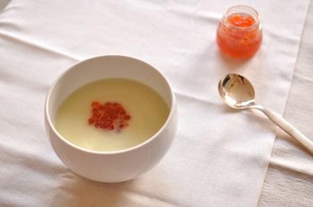 This is a very simple soup; the salmon roe makes it sing. We served it with Chablis. Thanks, Mary.