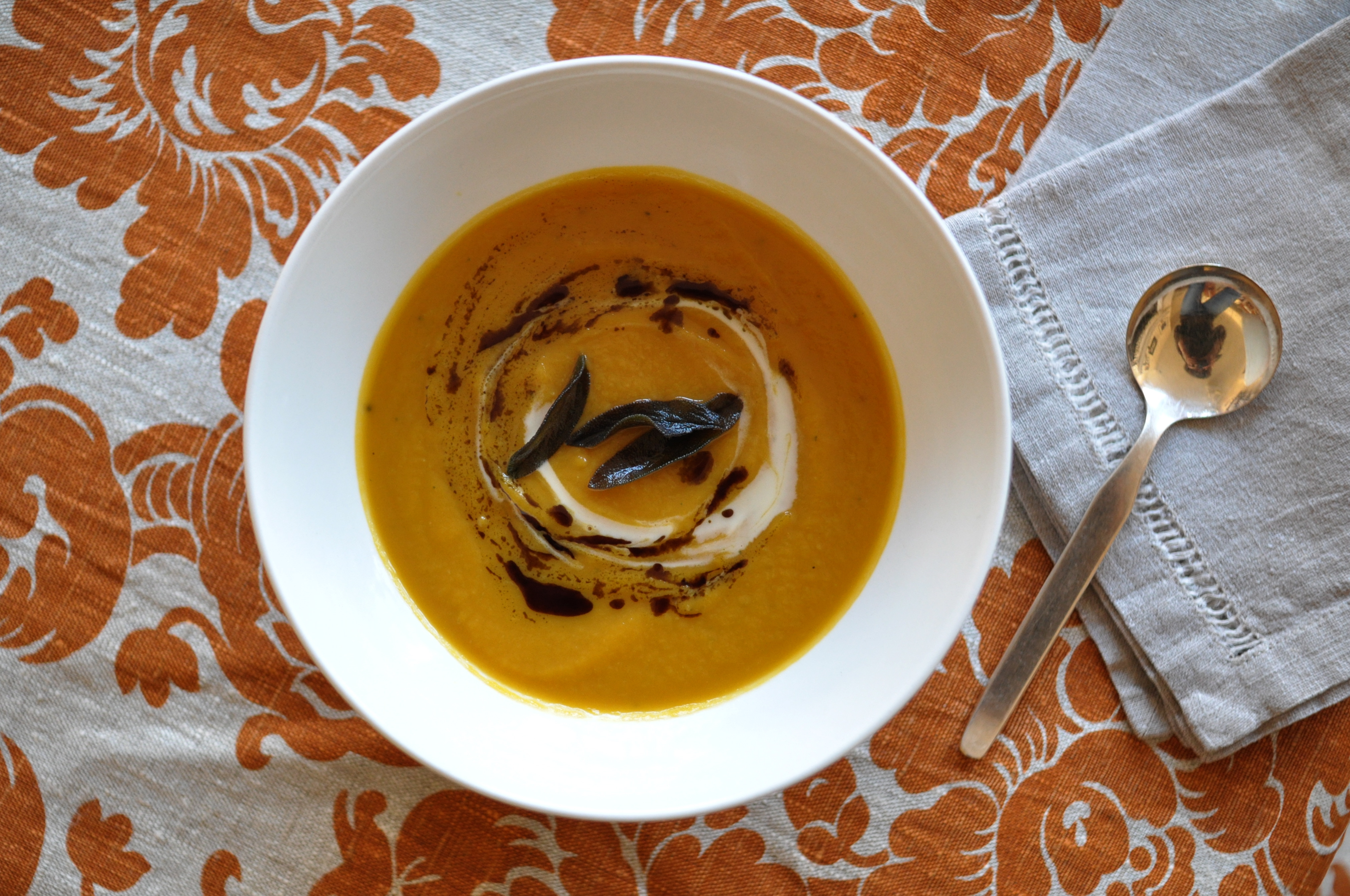 Serve garnished with crème fraîche and pumpkin seed oil, and a few sage leaves fried for 1 or 2 minutes in a little olive oil.
