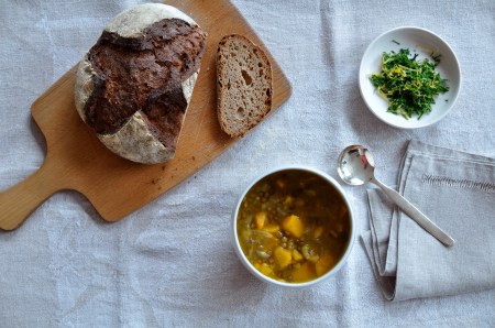 It was an inset day, which means no school, and after a sunny autumnal swim in the nearby lido — outdoor swimming pool in British lingo, in this case heated year-round to a luxurious 25°C — we went to reap our effort’s reward: e5 Bakehouse. Breakfast was over, we shared a spicy lentil soup with mustard seeds, and cake — but it was the soup that caught our attention. We vowed to recreate it, paying particular heed to the mustard, and, in an decisive move against Thomas’s tyranny of chunky soups, solemnly swore to blitz it to a creamy smoothness.