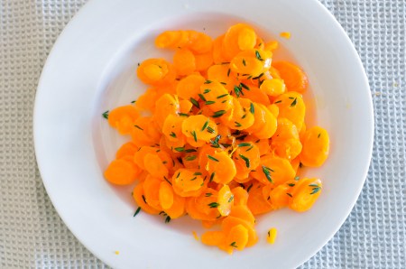 Cook the carrots in boiling water (covered) for about 10-12 minutes, until soft. Drain water and return the carrots to the pan. Grate orange zest and squeeze the juice over the carrots. Cook for another minute or so until the carrots have absorbed the juice. Sprinkle with fresh thyme.
