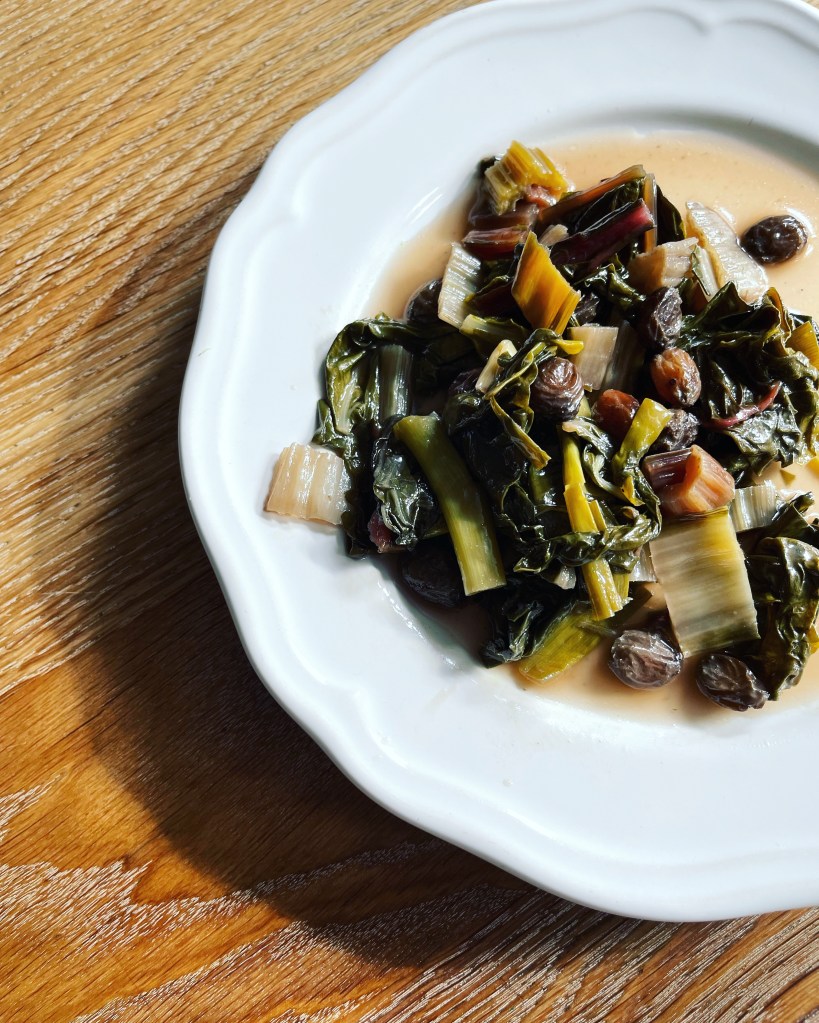 A caponata-inspired, quick chard dish to tackle the enormous amount of vegetables that have, again, accumulated in my fridge.