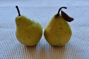 Peel, core, and cut pears, first into quarters and then into thin slices about 1/8 inch (3 mm). Squeeze lemon juice over the pieces of pear, toss, and gently combine into the batter.
